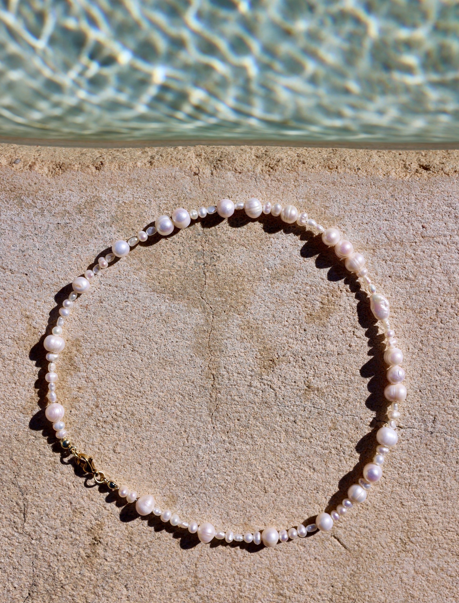 Introducing the Arc of Pearls Necklace—a graceful expression of balance and beauty, featuring four different types of genuine freshwater pearls.